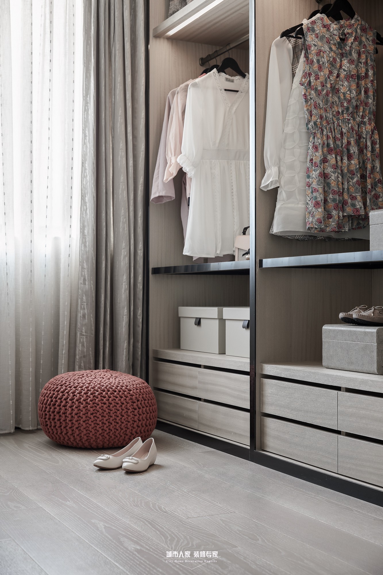 本案為現(xiàn)代主義風(fēng)格,回溯現(xiàn)代主義的源頭,首先想到的是“減”字,只有減少裝飾才能讓空間單純,設(shè)計(jì)滿足工業(yè)生產(chǎn)的要求,然而減得過(guò)多就會(huì)“Less is bore”,不免枯燥,脫離生活。